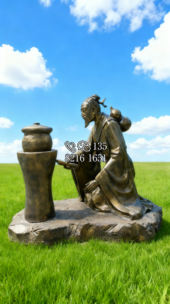 冉雪峰,湖北省中西醫(yī)會第一屆正會長,出生于醫(yī)藥世家,12歲起隨父采藥,同時習(xí)醫(yī)。17歲開診于故里,38歲懸壺于湖北武昌。雕塑高1.68米,玻璃鋼仿銅效果。
