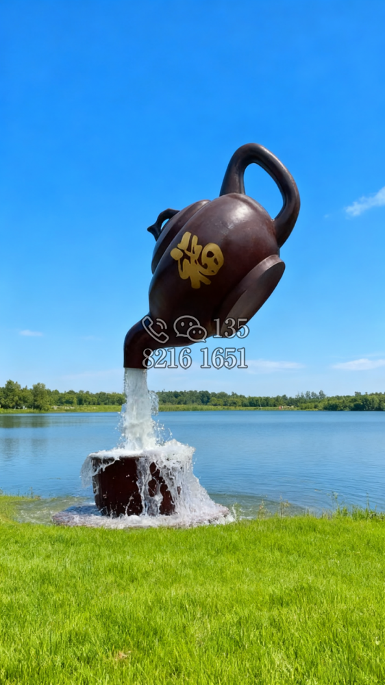 玻璃鋼材質,仿陶罐,大型流水景觀雕塑??偢?米,頂部陶罐長1.26米,中間主體陶罐高4.1米,去除底部一圈陶罐和外部飄帶造型,內置水管水泵,水被抽入頂部陶罐,再從陶罐口留出,形成水流源源不斷永遠流不完的錯覺。