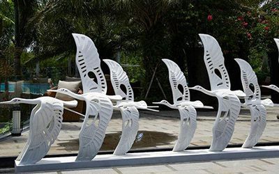 剪影雕塑,看的就是個(gè)輪廓!把你想做的東西(人、動(dòng)物、樹(shù)啊啥的),簡(jiǎn)化成影子形狀。材料選擇多:不銹鋼、耐候鋼(喜歡生銹那種質(zhì)感)、玻璃鋼、鍍鋅板、鐵板都成。最后還得靠噴漆,給它們打扮上顏色。