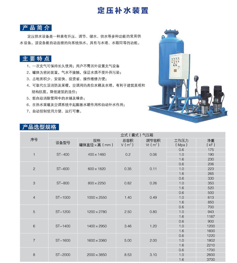 定壓供水設(shè)備是一種兼有升壓、調(diào)節(jié)、儲水、供水等多種功能的常用供水設(shè)備,該設(shè)備能自動連續(xù)的向系統(tǒng)供水,具有與水塔、水箱同等的功能。